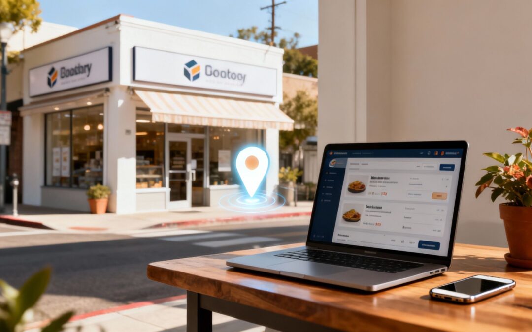 A person optimizing their Google Business Profile on a laptop, with a vibrant storefront visible in the background.